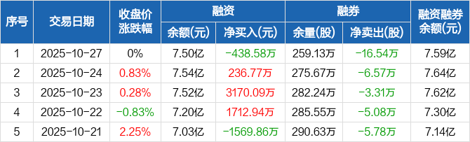 渤海租赁融资融券信息显示,2025年10月27日融资净偿还438.58万元;融资余额7.5亿元,较前一日下降0.58%。