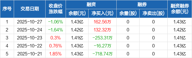 融资方面,当日融资买入563.74万元,融资偿还401.18万元,融资净买入162.56万元。融券方面,融券卖出0股,融券偿还0股,融券余量0股,融券余额0元。融资融券余额合计1.43亿元。