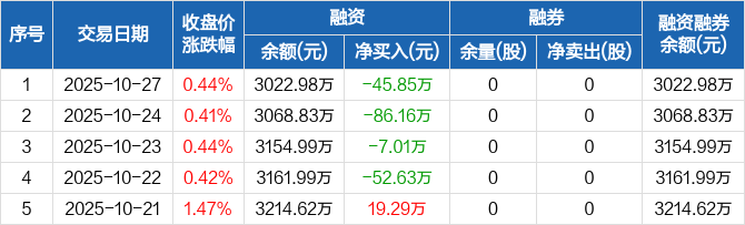 融资方面,当日融资买入313.23万元,融资偿还359.08万元,融资净偿还45.85万元,连续4日净偿还累计191.64万元。融券方面,融券卖出0股,融券偿还0股,融券余量0股,融券余额0元。融资融券余额合计3022.98万元。