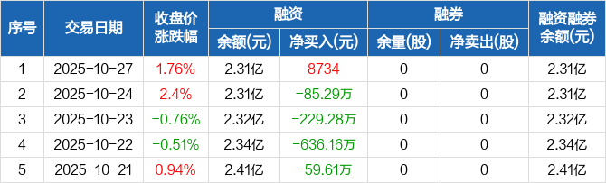 融资方面,当日融资买入1309.21万元,融资偿还1308.34万元,融资净买入8734元。融券方面,融券卖出0股,融券偿还0股,融券余量0股,融券余额0元。融资融券余额合计2.31亿元。