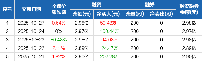 融资方面,当日融资买入840.5万元,融资偿还781.03万元,融资净买入59.48万元。融券方面,融券卖出0股,融券偿还0股,融券余量200股,融券余额1262元。融资融券余额合计2.98亿元。