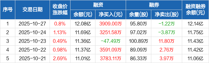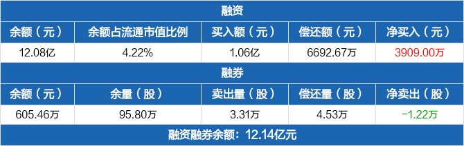 融资方面,当日融资买入1.06亿元,融资偿还6692.67万元,融资净买入3909万元。融券方面,融券卖出3.31万股,融券偿还4.53万股,融券余量95.8万股,融券余额605.46万元。融资融券余额合计12.14亿元。