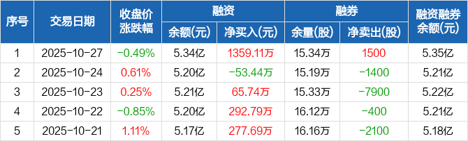融资方面,当日融资买入3180.11万元,融资偿还1821.01万元,融资净买入1359.11万元。融券方面,融券卖出2500股,融券偿还1000股,融券余量15.34万股,融券余额125.33万元。融资融券余额合计5.35亿元。