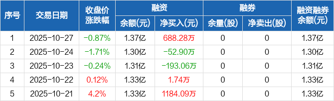 融资方面,当日融资买入1070.58万元,融资偿还382.29万元,融资净买入688.28万元。融券方面,融券卖出0股,融券偿还0股,融券余量0股,融券余额0元。融资融券余额合计1.37亿元。