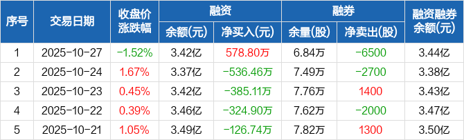融资方面,当日融资买入1982.48万元,融资偿还1403.68万元,融资净买入578.8万元。融券方面,融券卖出300股,融券偿还6800股,融券余量6.84万股,融券余额106.64万元。融资融券余额合计3.44亿元。