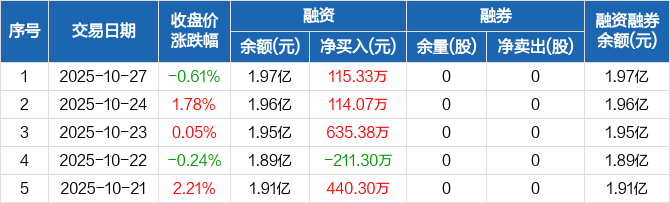 融资方面,当日融资买入1555.64万元,融资偿还1440.3万元,融资净买入115.33万元,连续3日净买入累计864.79万元。融券方面,融券卖出0股,融券偿还0股,融券余量0股,融券余额0元。融资融券余额合计1.97亿元。