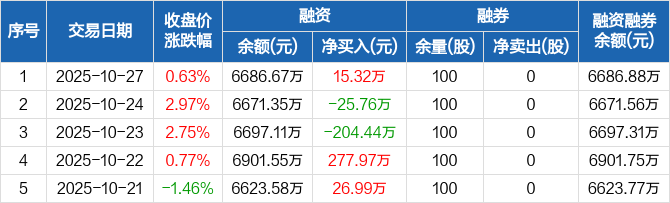 融资方面,当日融资买入848.94万元,融资偿还833.62万元,融资净买入15.32万元。融券方面,融券卖出0股,融券偿还0股,融券余量100股,融券余额2093元。融资融券余额合计6686.88万元。
