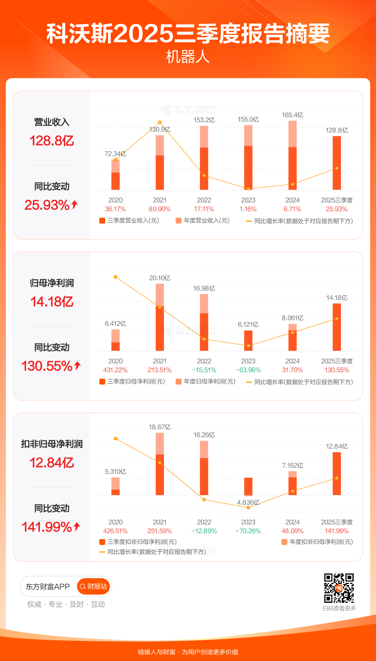 科沃斯10月25日发布2025年三季报显示,公司前三季实现营业收入128.77亿元,同比增长25.93%;归母净利润14.18亿元,同比增长130.55%;扣非归母净利润12.84亿元,同比增长141.99%。