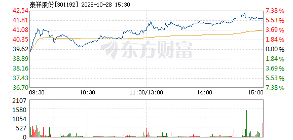 泰祥股份盘中快速上涨,5分钟内涨幅超过2%,截至9点36分,报40.96元,成交1238.29万元,换手率0.65%。