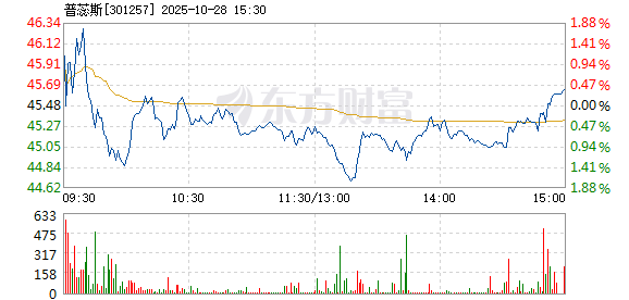 普蕊斯盘中快速回调,5分钟内跌幅超过2%,截至9点44分,报45.35元,成交1728.19万元,换手率0.50%。