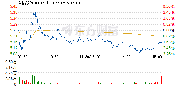 常铝股份盘中快速反弹,5分钟内涨幅超过2%,截至9点52分,报5.31元,成交3.04亿元,换手率7.38%。