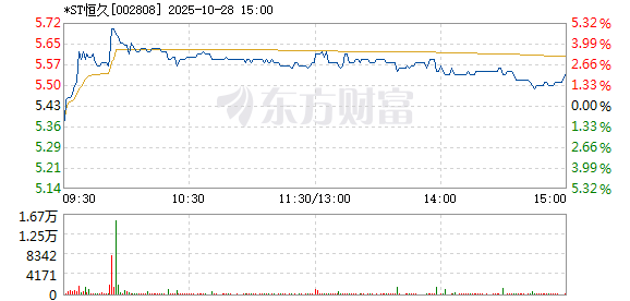 *ST恒久盘中打开涨停,现报5.67元,成交2726.68万元,换手率2.94%。该股之前于9点52分涨停。