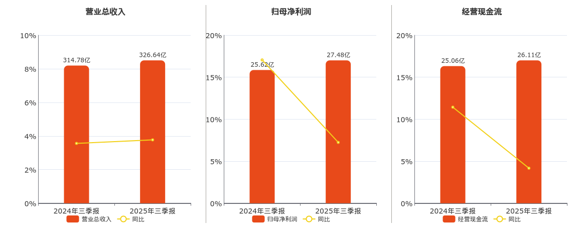 公司营业总收入为326.64亿元。归母净利润为27.48亿元。经营活动现金净流入为26.11亿元。