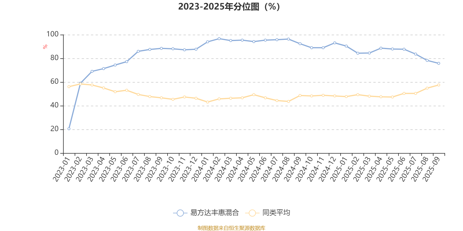 通过所选区间该基金净值增长率分位图,可以观察该基金与同类基金业绩比较情况。图为坐标原点到区间内某时点的净值增长率在同类基金中的分位数。