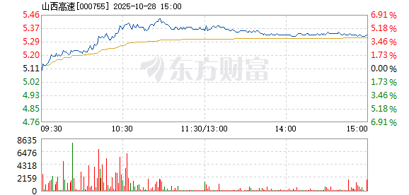 山西高速盘中涨幅达5%,截至10点27分,报5.38元,成交5699.54万元,换手率0.74%。