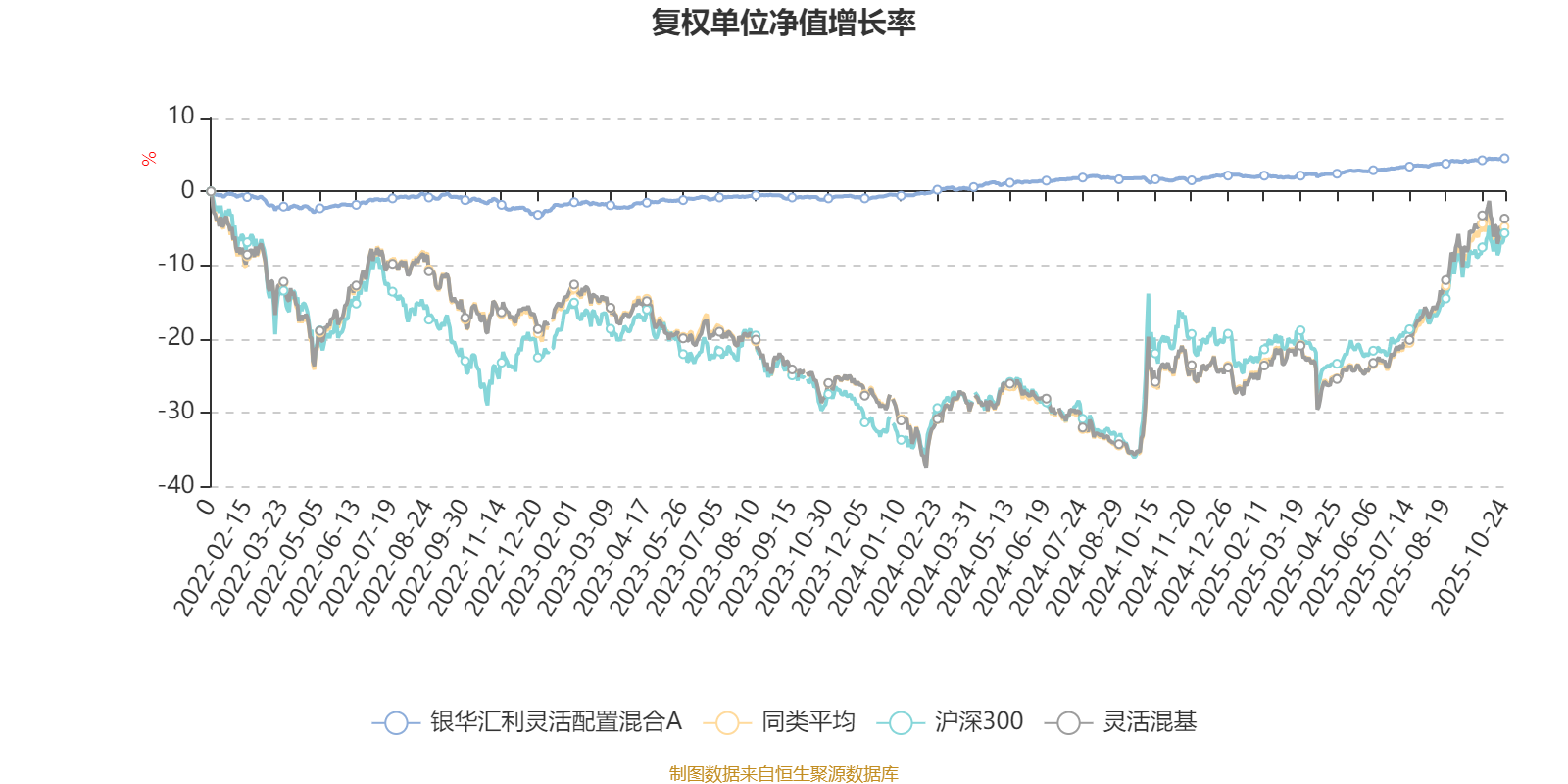 截至10月24日,银华汇利灵活配置混合A近三个月复权单位净值增长率为0.97%,位于同类可比基金1154/1287;近半年复权单位净值增长率为2.03%,位于同类可比基金1239/1287;近一年复权单位净值增长率为2.86%,位于同类可比基金1203/1287;近三年复权单位净值增长率为5.85%,位于同类可比基金837/1286。