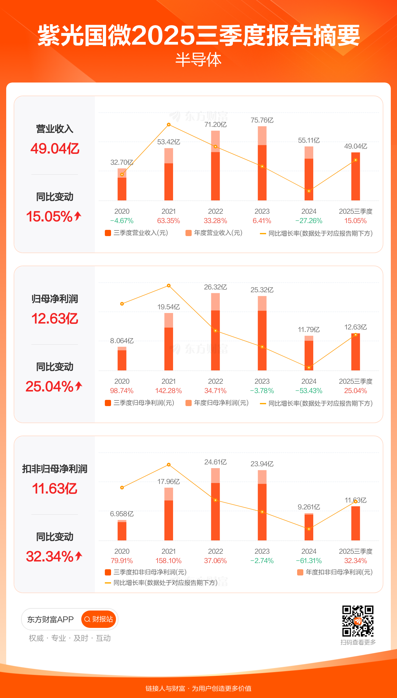 紫光国微10月28日发布2025年三季报显示,公司前三季实现营业收入49.04亿元,同比增长15.05%;归母净利润12.63亿元,同比增长25.04%;扣非归母净利润11.63亿元,同比增长32.34%。
