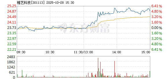 雅艺科技盘中快速上涨,5分钟内涨幅超过2%,截至13点26分,报24.75元,成交3577.87万元,换手率2.72%。