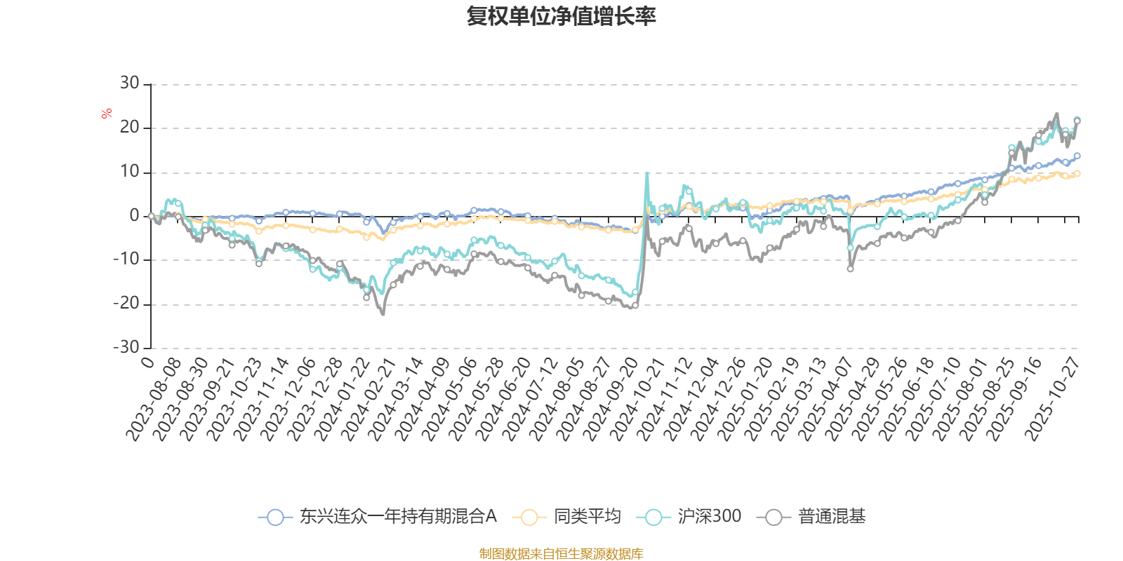 截至10月27日,东兴连众一年持有期混合A近三个月复权单位净值增长率为4.88%,位于同类可比基金121/629;近半年复权单位净值增长率为10.11%,位于同类可比基金91/629;近一年复权单位净值增长率为13.03%,位于同类可比基金73/623。