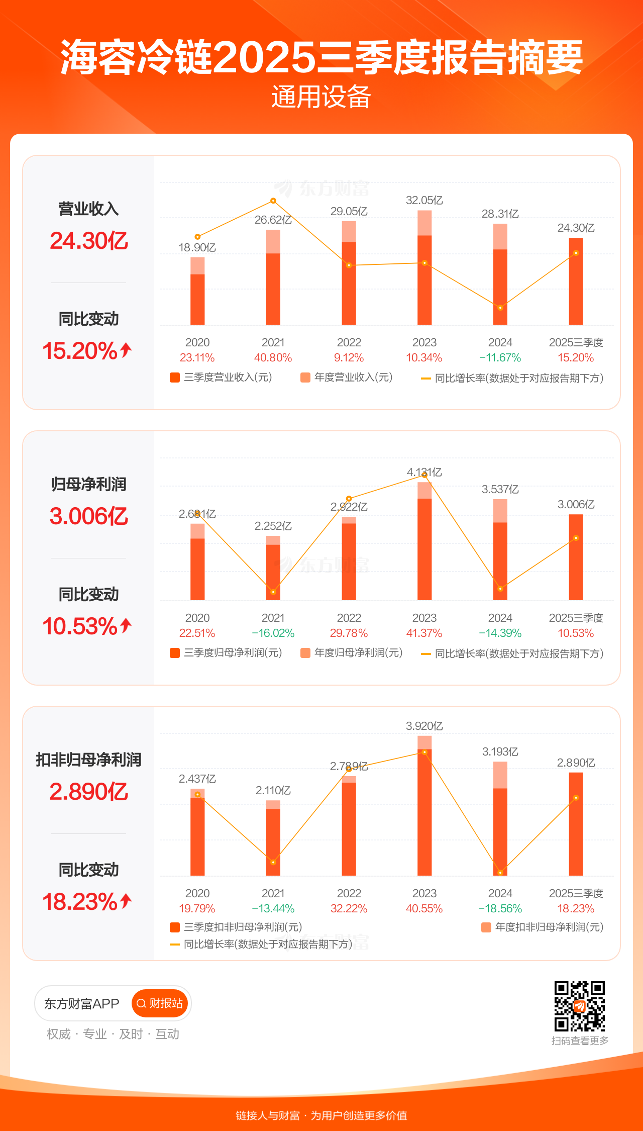 海容冷链10月29日发布2025年三季报显示,公司前三季实现营业收入24.30亿元,同比增长15.20%;归母净利润3.01亿元,同比增长10.53%;扣非归母净利润2.89亿元,同比增长18.23%。
