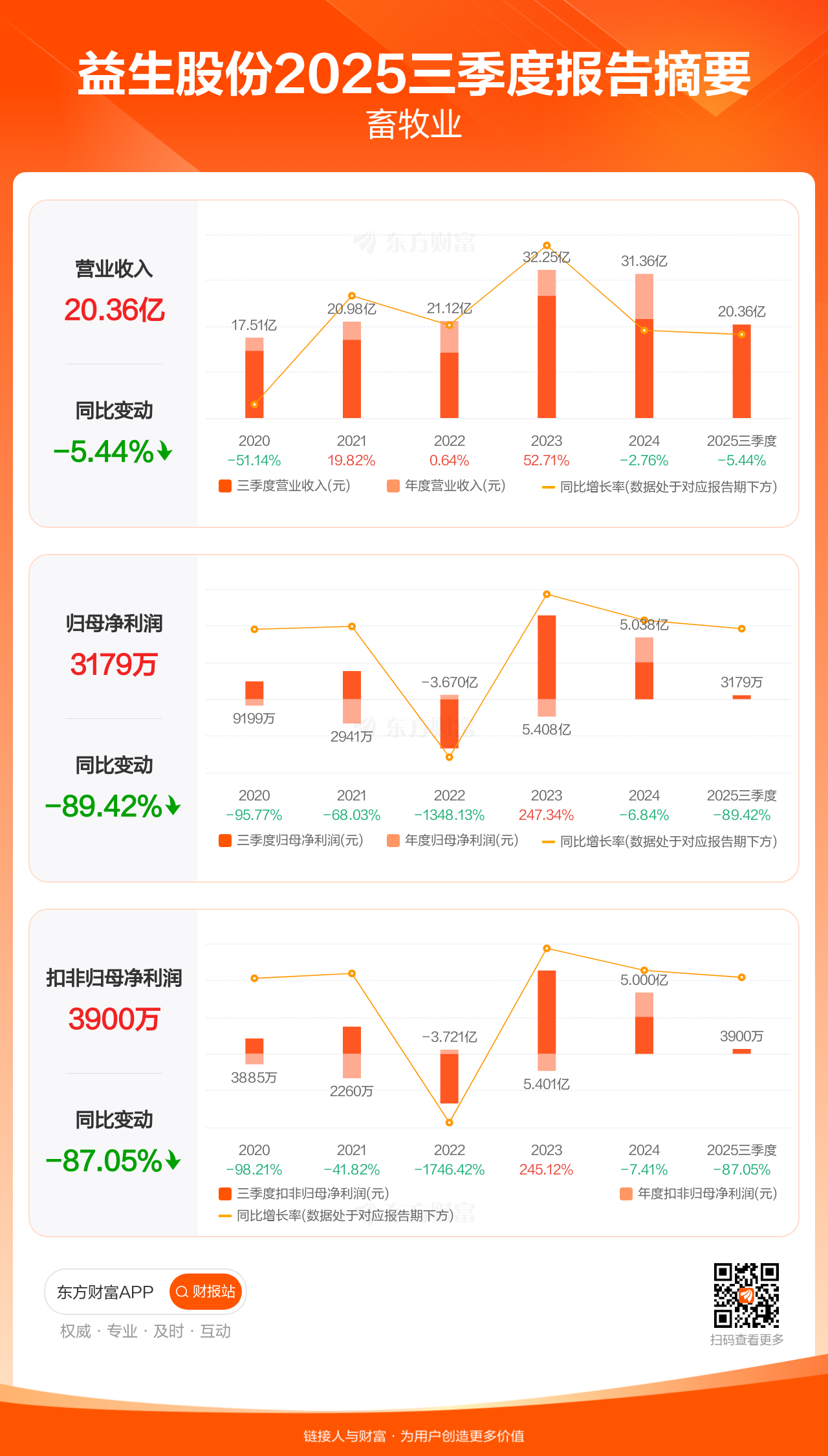 益生股份10月28日发布2025年三季报显示,公司前三季实现营业收入20.36亿元,同比下滑5.44%;归母净利润3178.69万元,同比下滑89.42%;扣非归母净利润3899.66万元,同比下滑87.05%。