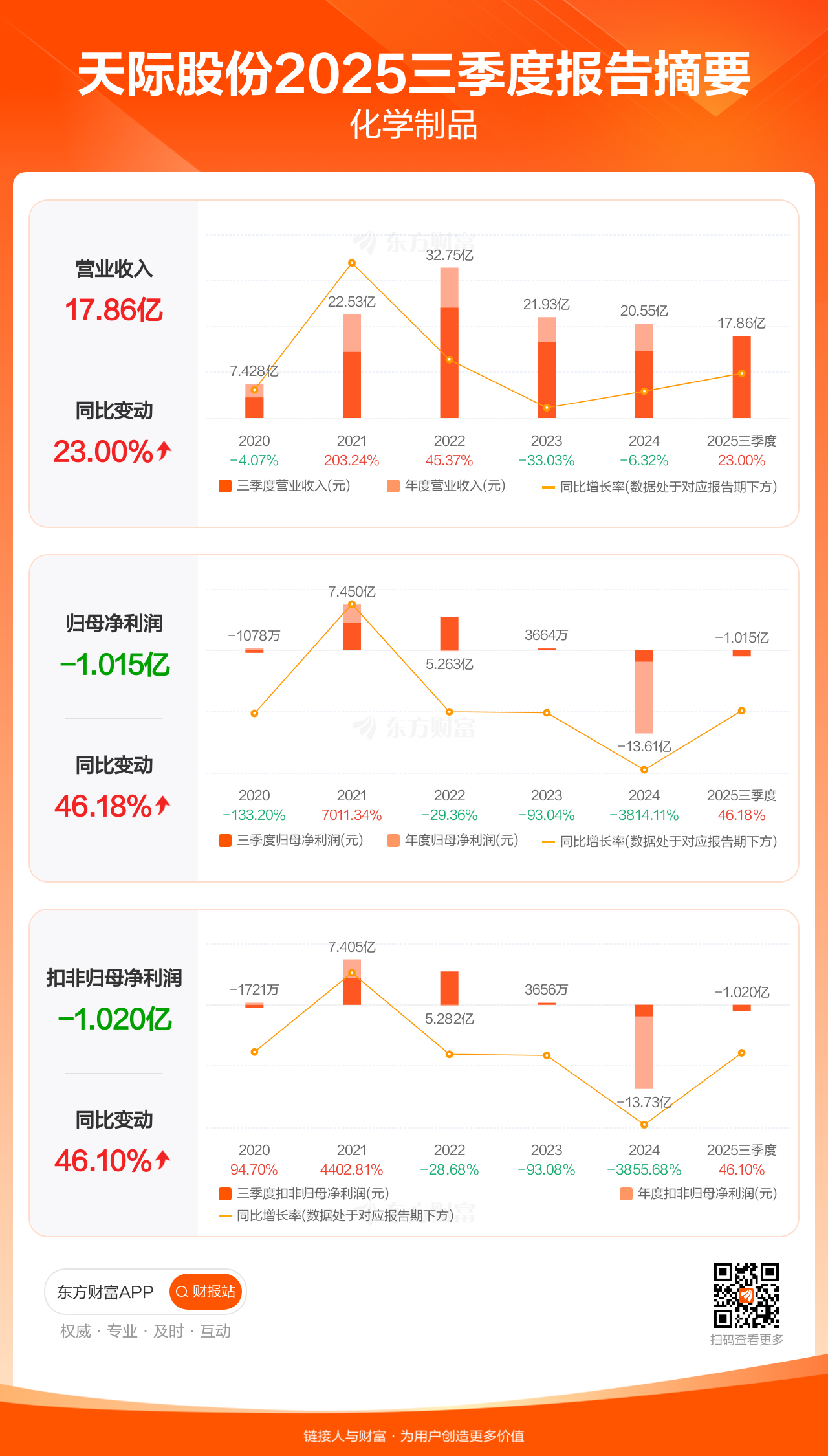 天际股份10月29日发布2025年三季报显示,公司前三季实现营业收入17.86亿元,同比增长23.00%;归母净利润-1.01亿元;扣非归母净利润-1.02亿元。