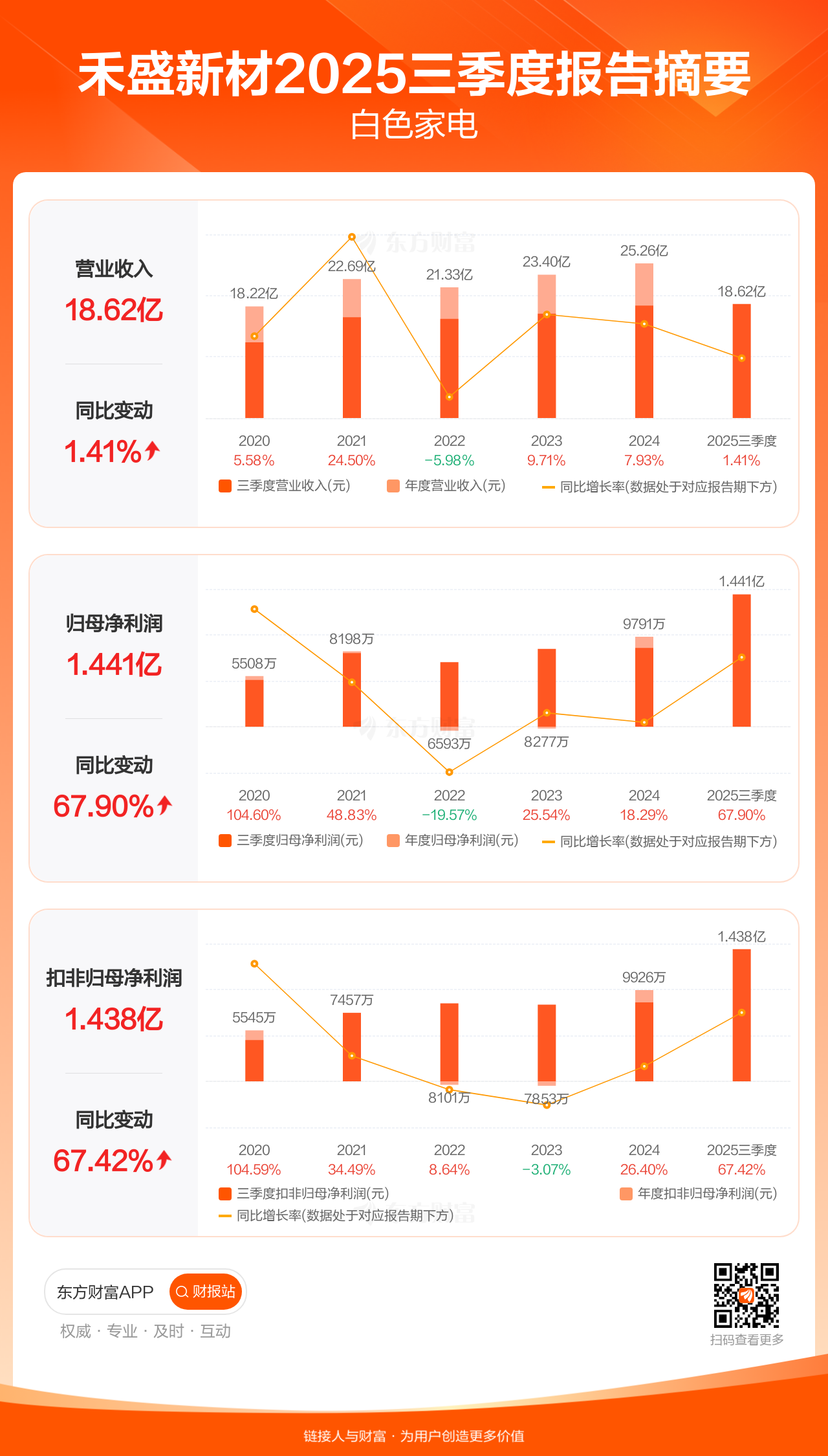 禾盛新材10月29日发布2025年三季报显示,公司前三季实现营业收入18.62亿元,同比增长1.41%;归母净利润1.44亿元,同比增长67.90%;扣非归母净利润1.44亿元,同比增长67.42%。