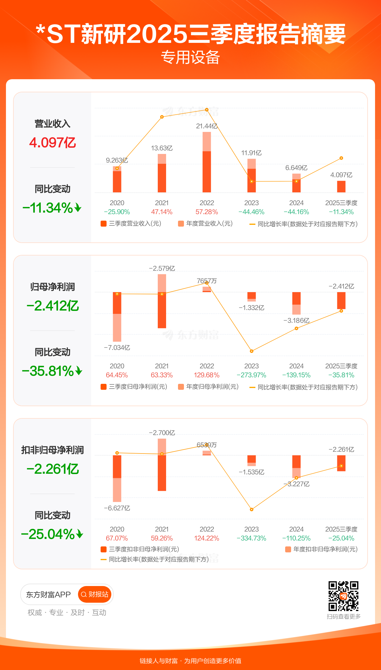 *ST新研10月29日发布2025年三季报显示,公司前三季实现营业收入4.10亿元,同比下滑11.34%;归母净利润-2.41亿元;扣非归母净利润-2.26亿元。