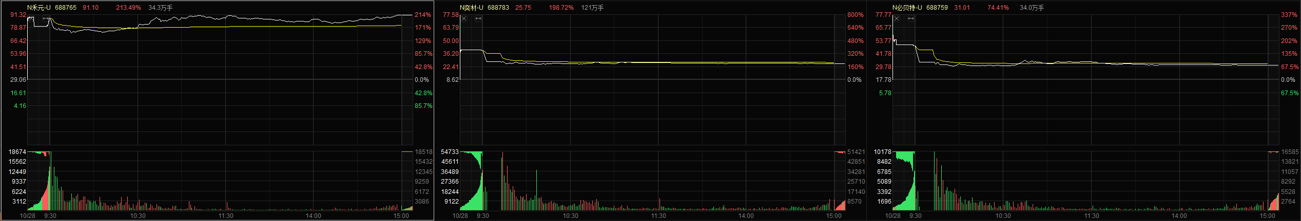 上市首日,三家硬科技企业表现优异。截至今日(10月28日)收盘,N奕材收涨198.7%,市值1040亿元;N禾元收涨213.49%,市值325.7亿元;N必贝收涨74.41%,市值139.6亿元。