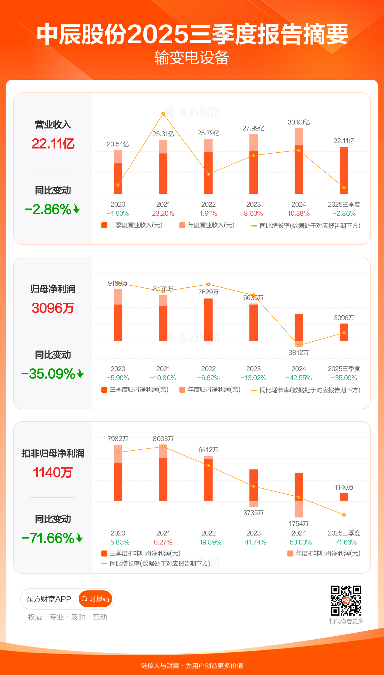 中辰股份10月29日发布2025年三季报显示,公司前三季实现营业收入22.11亿元,同比下滑2.86%;归母净利润3095.87万元,同比下滑35.09%;扣非归母净利润1139.90万元,同比下滑71.66%。