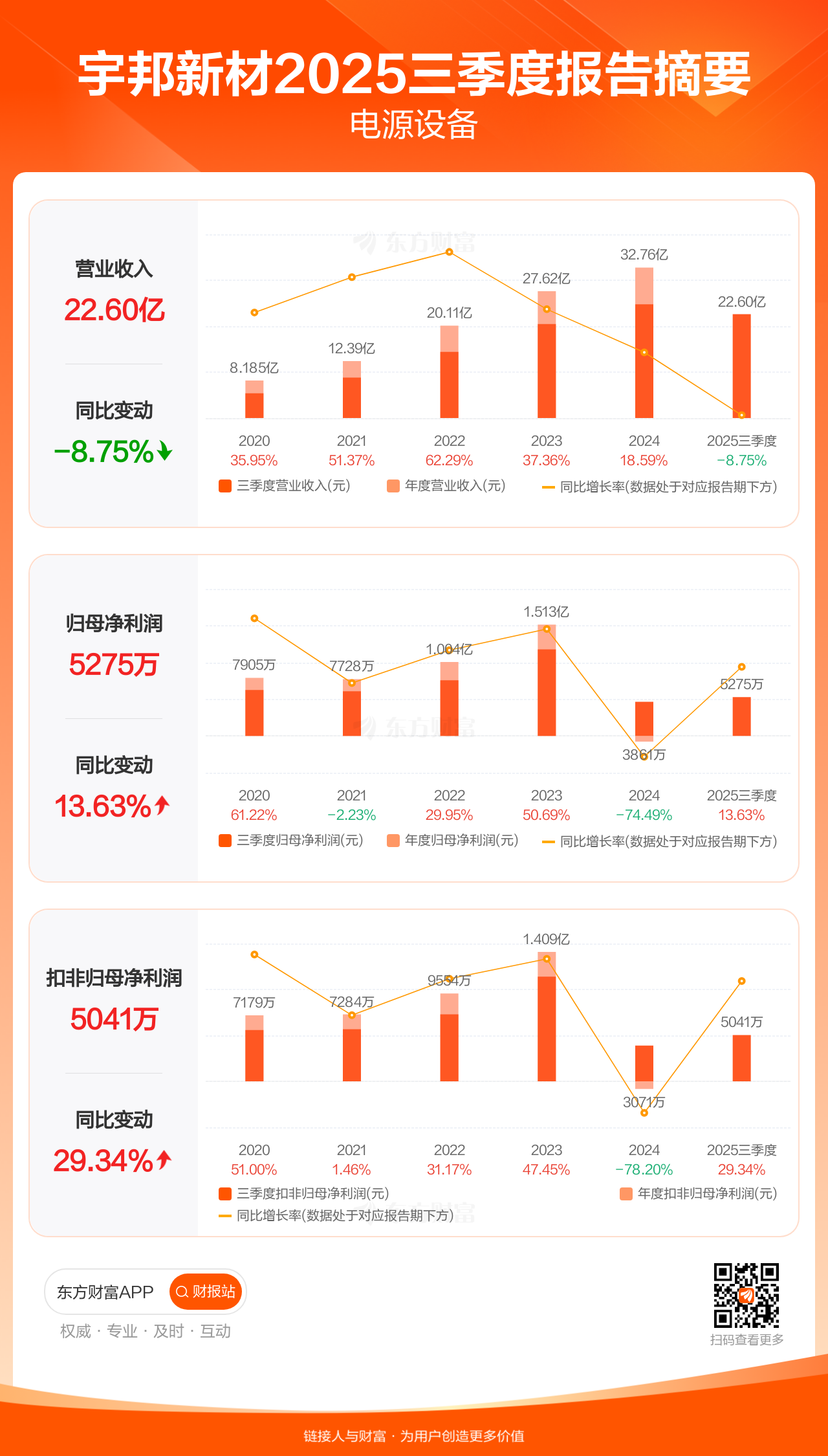 宇邦新材10月29日发布2025年三季报显示,公司前三季实现营业收入22.60亿元,同比下滑8.75%;归母净利润5275.27万元,同比增长13.63%;扣非归母净利润5041.43万元,同比增长29.34%。