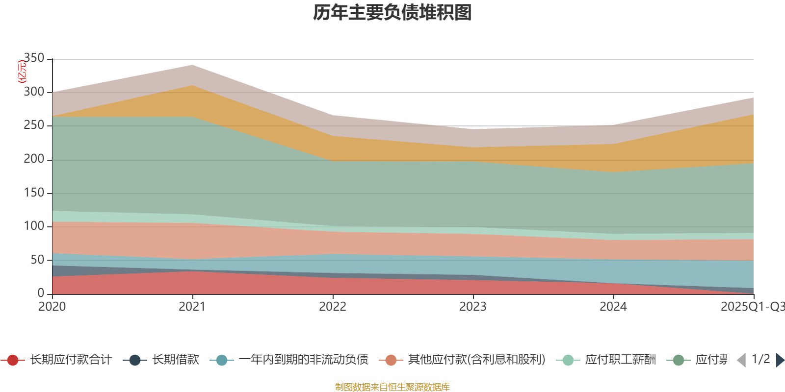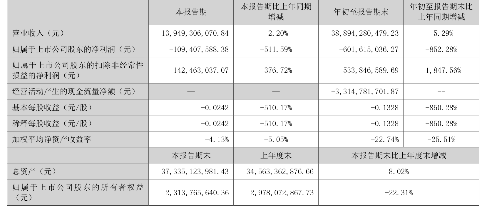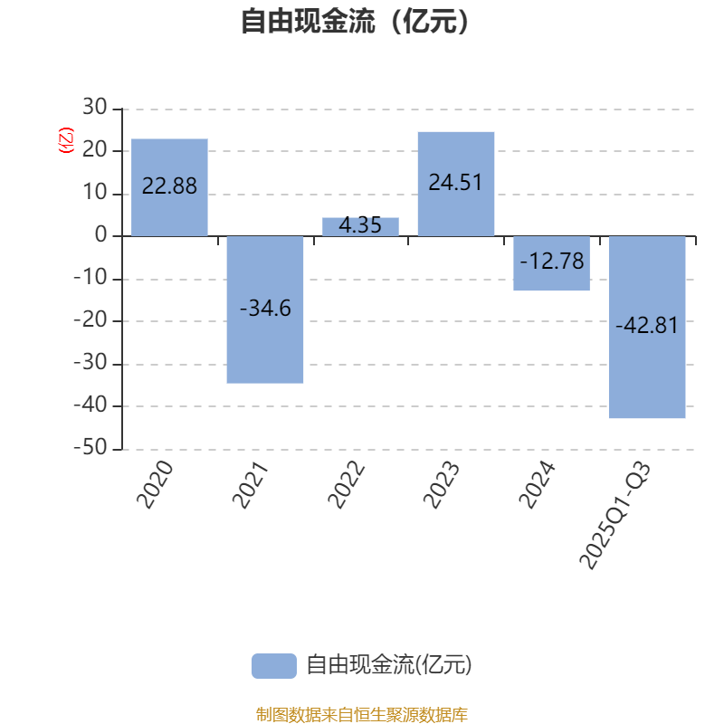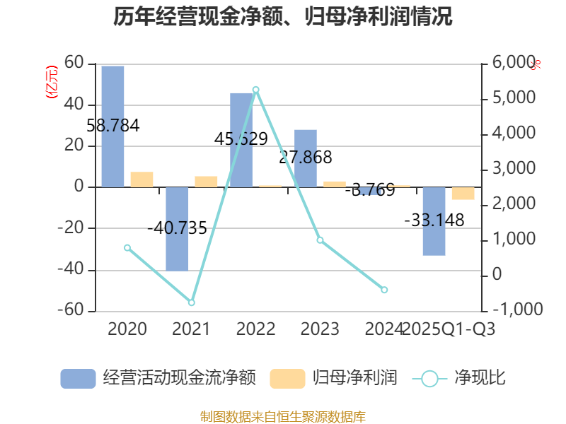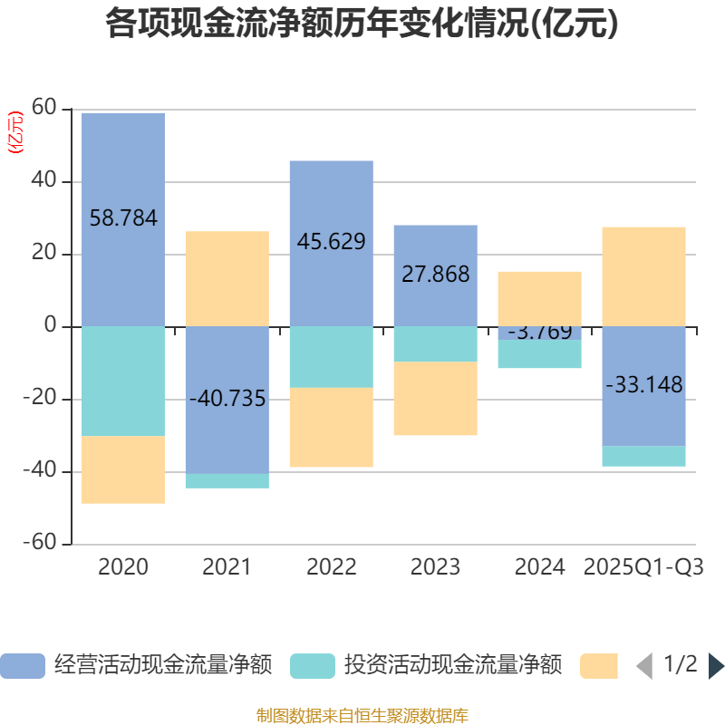 2025年前三季度,公司经营活动现金流净额为-33.15亿元,同比减少17.77亿元;筹资活动现金流净额27.32亿元,同比增加8.55亿元;投资活动现金流净额-5.54亿元,上年同期为-5.63亿元。