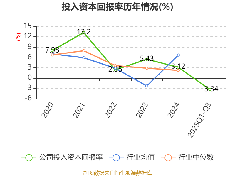 盈利能力方面, 2025年前三季度公司加权平均净资产收益率为-22.74%,同比下降25.51个百分点。公司2025年前三季度投入资本回报率为-3.34%,较上年同期下降5.83个百分点。