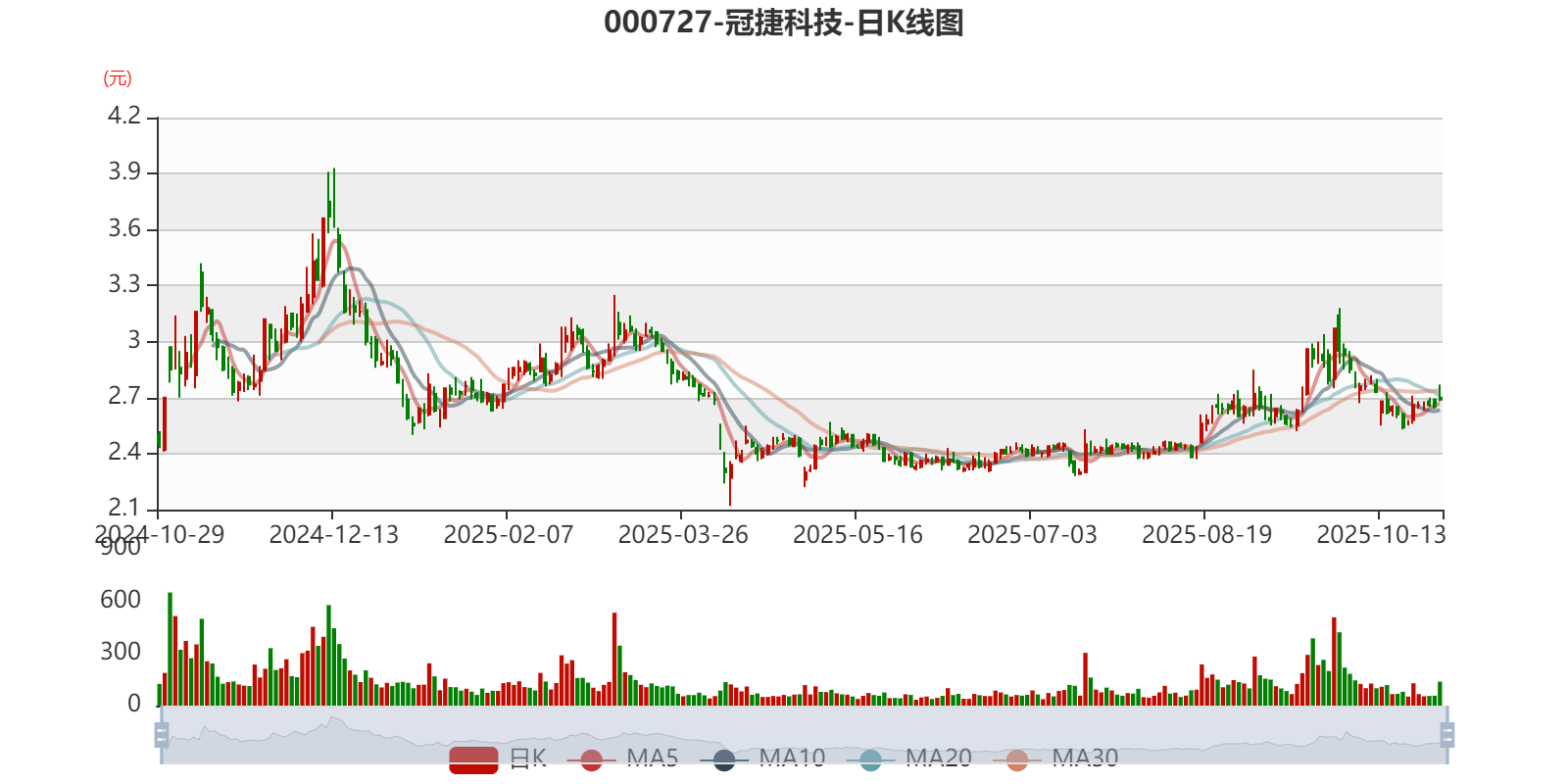 中证智能财讯冠捷科技(000727)10月29日披露2025年第三季度报告。前三季度公司实现营业总收入388.94亿元,同比下降5.29%;归母净利润亏损6.02亿元,上年同期盈利7997.23万元;扣非净利润亏损5.34亿元,上年同期盈利3054.8万元;经营活动产生的现金流量净额为-33.15亿元,上年同期为-15.38亿元;报告期内,冠捷科技基本每股收益为-0.1328元,加权平均净资产收益率为-22.74%。