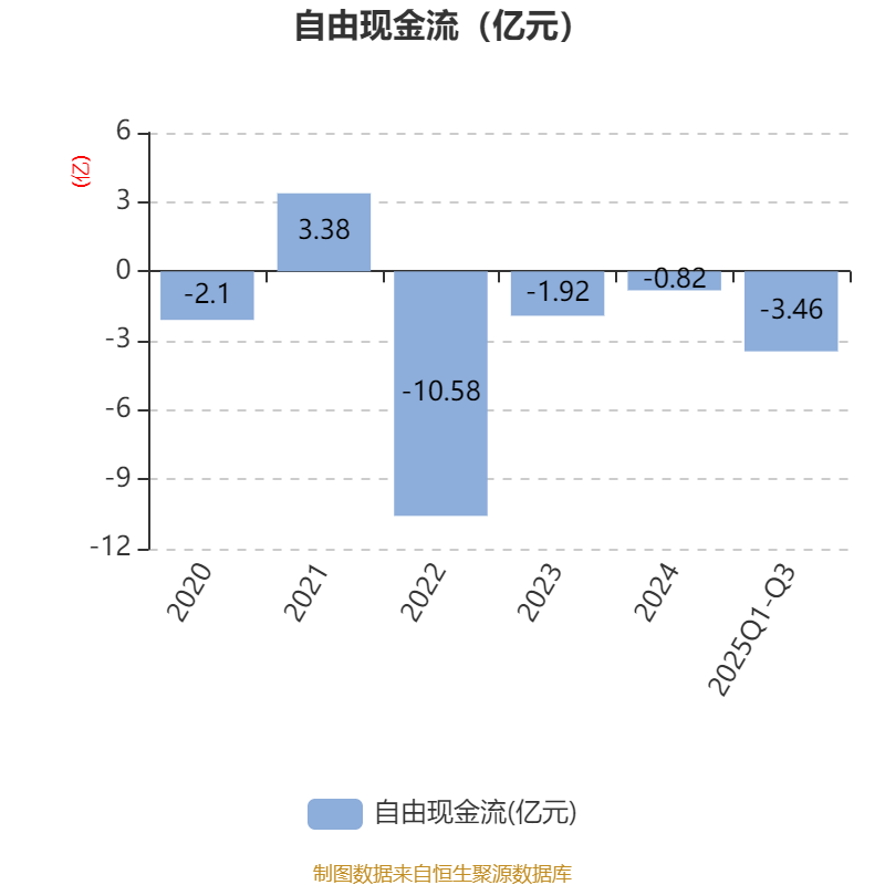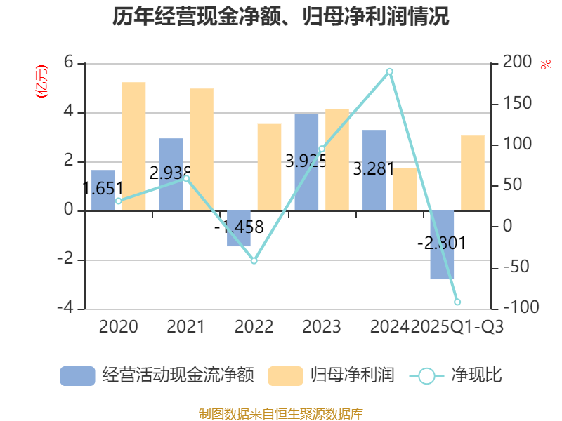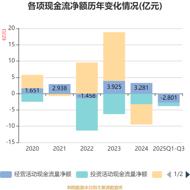 2025年前三季度,公司经营活动现金流净额为-2.8亿元,同比减少5.08亿元;筹资活动现金流净额1059.35万元,同比增加5.42亿元;投资活动现金流净额-1.02亿元,上年同期为-1.85亿元。
