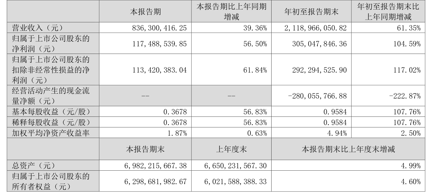 中证智能财讯金雷股份(300443)10月29日披露2025年第三季度报告。前三季度公司实现营业总收入21.19亿元,同比增长61.35%;归母净利润3.05亿元,同比增长104.59%;扣非净利润2.92亿元,同比增长117.02;经营活动产生的现金流量净额为-2.8亿元,上年同期为2.28亿元;报告期内,金雷股份基本每股收益为0.9584元,加权平均净资产收益率为4.94%。