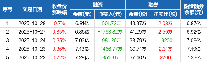融资方面,当日融资买入1527.93万元,融资偿还2029.66万元,融资净偿还501.72万元,连续5日净偿还累计5554.88万元。融券方面,融券卖出2.85万股,融券偿还7700股,融券余量43.37万股,融券余额623.66万元。融资融券余额合计6.87亿元。