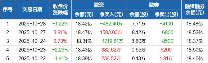 融资方面,当日融资买入9165.78万元,融资偿还9648.18万元,融资净偿还482.4万元。融券方面,融券卖出400股,融券偿还4500股,融券余量7.71万股,融券余额544.71万元。融资融券余额合计18.48亿元。