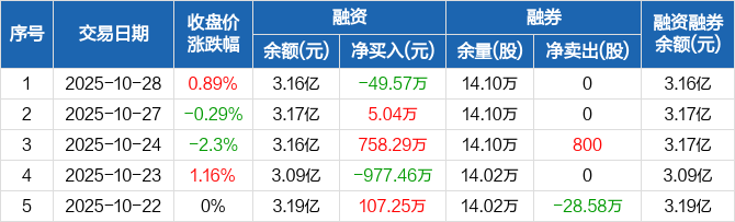 融资方面,当日融资买入938.84万元,融资偿还988.4万元,融资净偿还49.57万元。融券方面,融券卖出0股,融券偿还0股,融券余量14.1万股,融券余额48.22万元。融资融券余额合计3.16亿元。