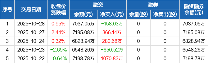 融资方面,当日融资买入1194.36万元,融资偿还1352.4万元,融资净偿还158.03万元。融券方面,融券卖出0股,融券偿还0股,融券余量0股,融券余额0元。融资融券余额合计7037.05万元。