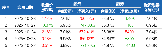 融资方面,当日融资买入3330.01万元,融资偿还2563.09万元,融资净买入766.92万元。融券方面,融券卖出400股,融券偿还1.44万股,融券余量33.97万股,融券余额275.5万元。融资融券余额合计7.04亿元。