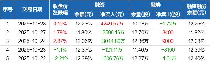融资方面,当日融资买入1.09亿元,融资偿还6677.06万元,融资净买入4249.57万元。融券方面,融券卖出8100股,融券偿还2.53万股,融券余量10.98万股,融券余额176.56万元。融资融券余额合计12.25亿元。