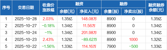 融资方面,当日融资买入2596.57万元,融资偿还2448.49万元,融资净买入148.08万元,连续3日净买入累计361.62万元。融券方面,融券卖出0股,融券偿还0股,融券余量8900股,融券余额9.83万元。融资融券余额合计1.35亿元。