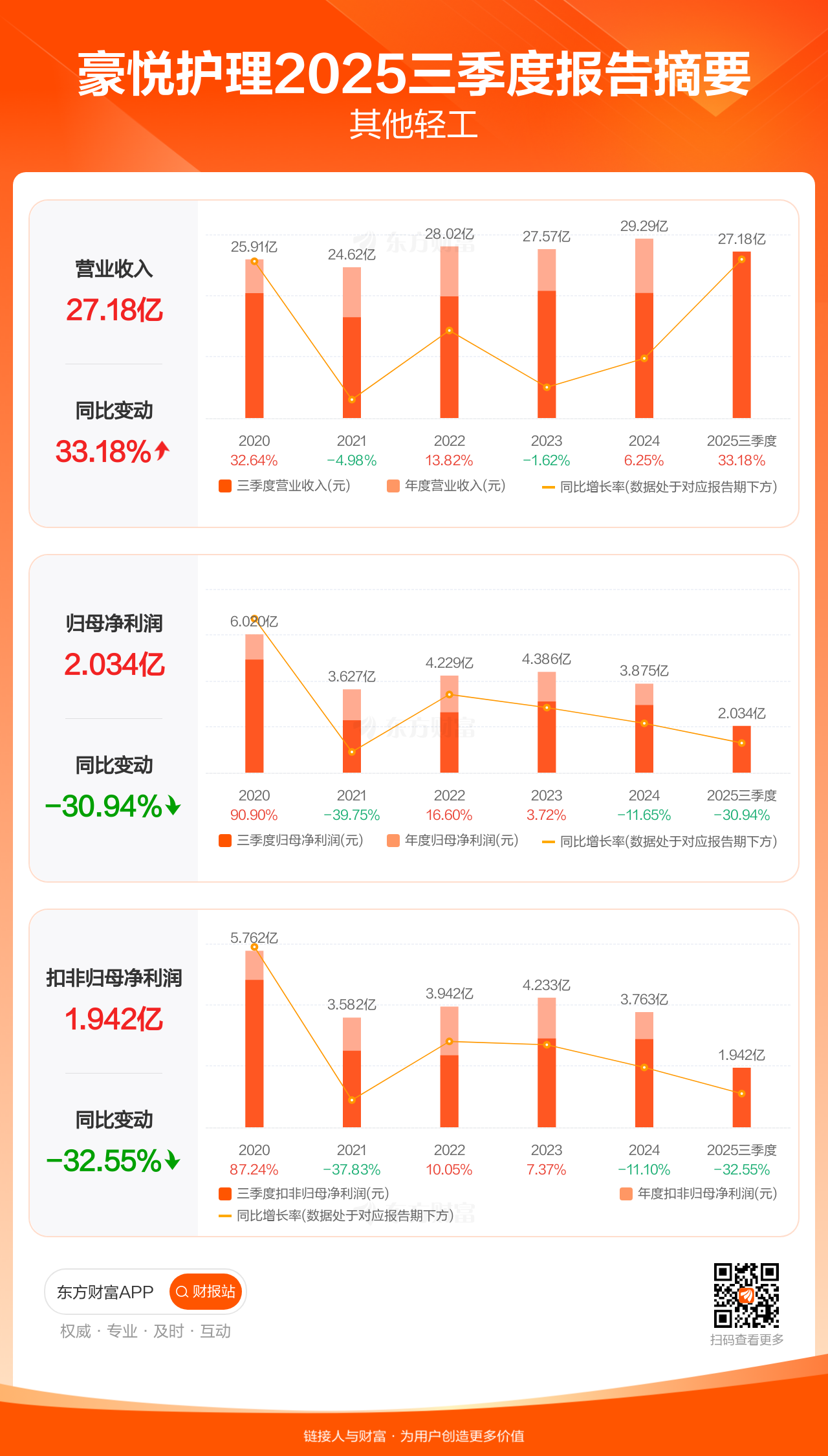 豪悦护理10月28日发布2025年三季报显示,公司前三季实现营业收入27.18亿元,同比增长33.18%;归母净利润2.03亿元,同比下滑30.94%;扣非归母净利润1.94亿元,同比下滑32.55%。