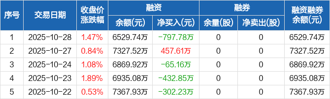 融资方面,当日融资买入410.53万元,融资偿还1208.31万元,融资净偿还797.78万元。融券方面,融券卖出0股,融券偿还0股,融券余量0股,融券余额0元。融资融券余额合计6529.74万元。