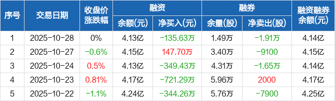 融资方面,当日融资买入926.75万元,融资偿还1062.38万元,融资净偿还135.63万元。融券方面,融券卖出9400股,融券偿还2.85万股,融券余量1.49万股,融券余额14.81万元。融资融券余额合计4.14亿元。