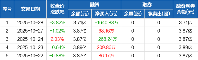 融资方面,当日融资买入2999.03万元,融资偿还4639.92万元,融资净偿还1640.88万元。融券方面,融券卖出0股,融券偿还0股,融券余量0股,融券余额0元。融资融券余额合计3.71亿元。