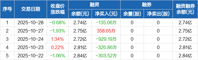 融资方面,当日融资买入690.34万元,融资偿还825.4万元,融资净偿还135.06万元。融券方面,融券卖出0股,融券偿还0股,融券余量0股,融券余额0元。融资融券余额合计2.74亿元。