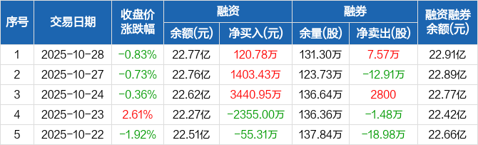 融资方面,当日融资买入5622.94万元,融资偿还5502.16万元,融资净买入120.78万元,连续3日净买入累计4965.16万元。融券方面,融券卖出10.94万股,融券偿还3.37万股,融券余量131.3万股,融券余额1418.07万元。融资融券余额合计22.91亿元。
