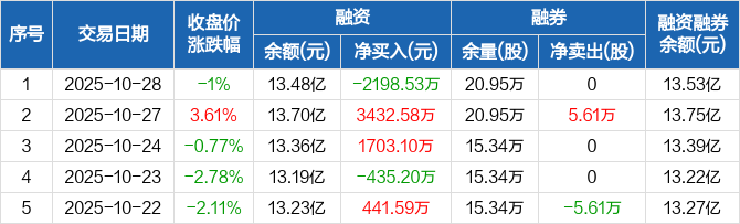 融资方面,当日融资买入1.72亿元,融资偿还1.94亿元,融资净偿还2198.53万元。融券方面,融券卖出0股,融券偿还0股,融券余量20.95万股,融券余额499.87万元。融资融券余额合计13.53亿元。